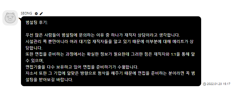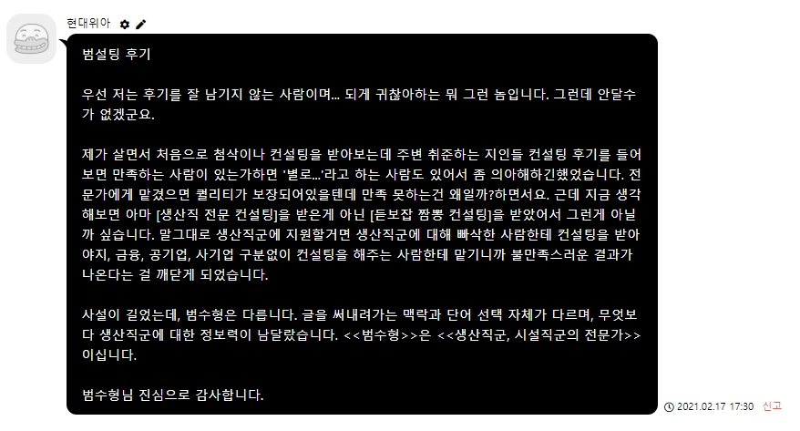 생산직 범설팅의 가장 큰 강점이 아닌가 생각한다.