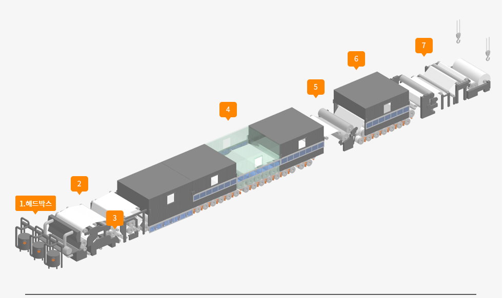 초지공정은 모든 설비가 '롤' 로 이루어져 있어 종이를 얇게 찍어내고 건조시키는 과정을 거친다.
