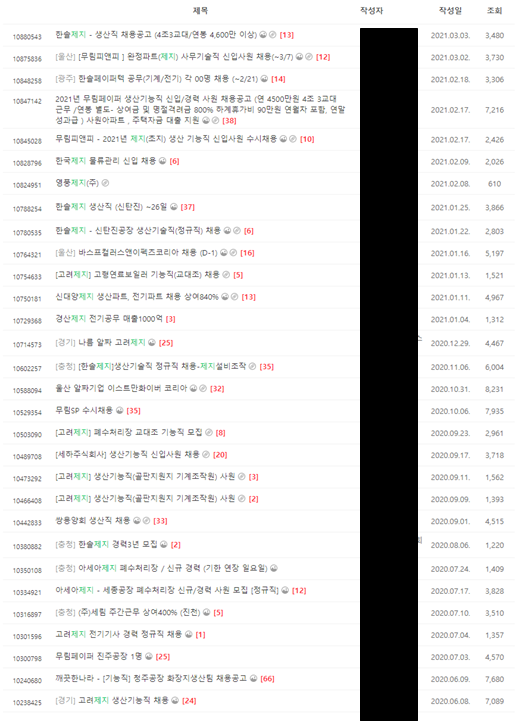 1년도 채 안된기간에 제지회사 채용만 30건이 훌쩍 넘는것을 알 수 있다.