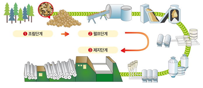 목재를 이용하여 제지를 만들수 있는 펄프로 가공하는 과정이다.