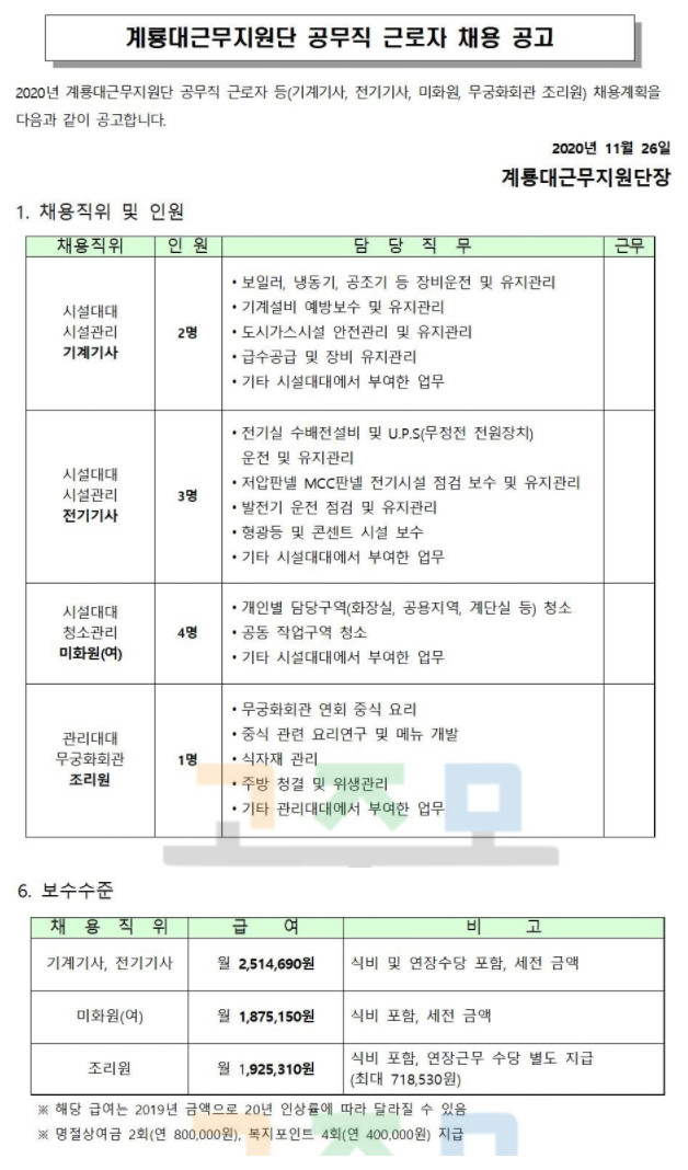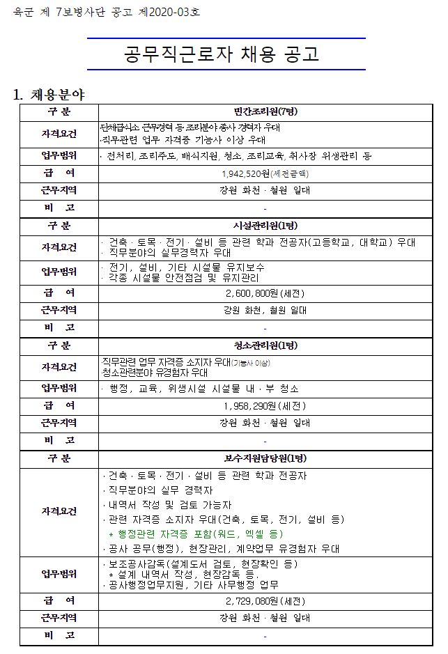 군부대 환경기술,시설을 담당하는 공무직을 뽑는공고이다.