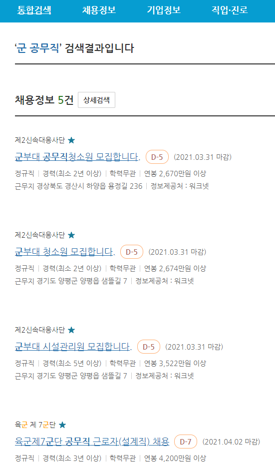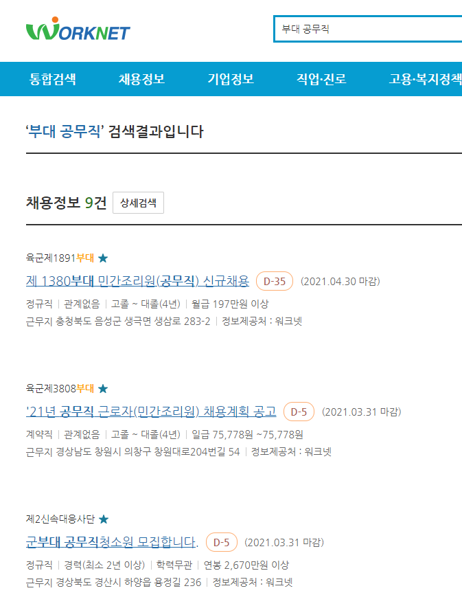경험상 군부대의 경우 공고를 "워크넷"에 올리는 경향이 있다.