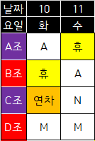 4. B조 사람이 휴일 출근을 하여 휴일특근