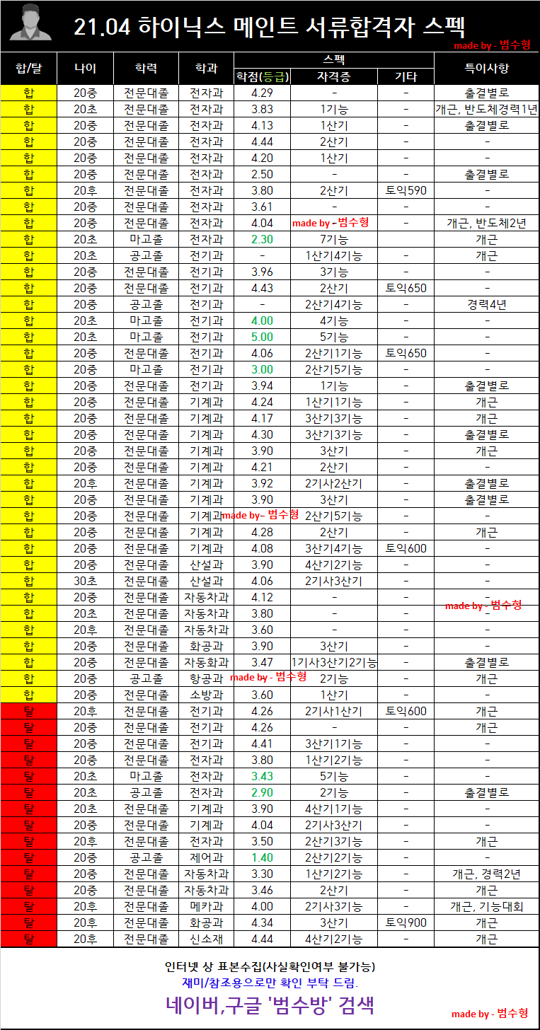 [하이닉스] 서류전형 합격/불합 스펙정리