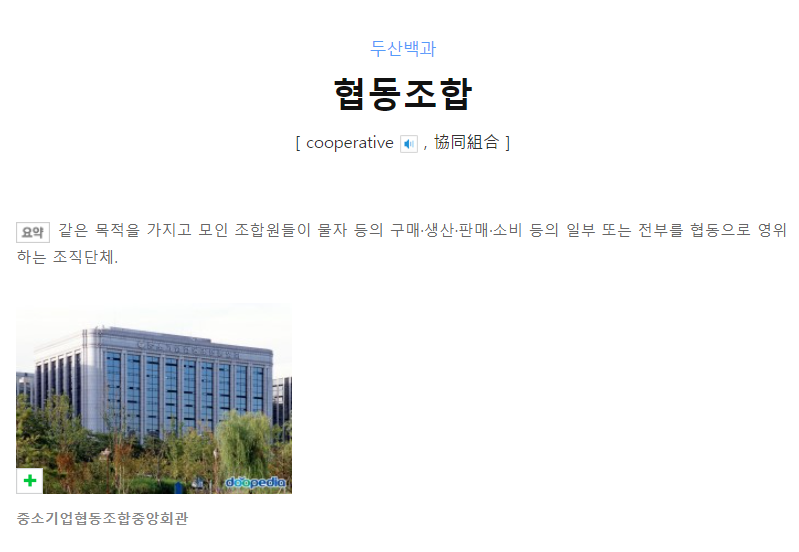 백과사전에는 '조합원'들이 모여 만든 '구매 생산 판매 소비' 등 협동으로 영위하는 조직단체 라는 설명을 해놓았다.