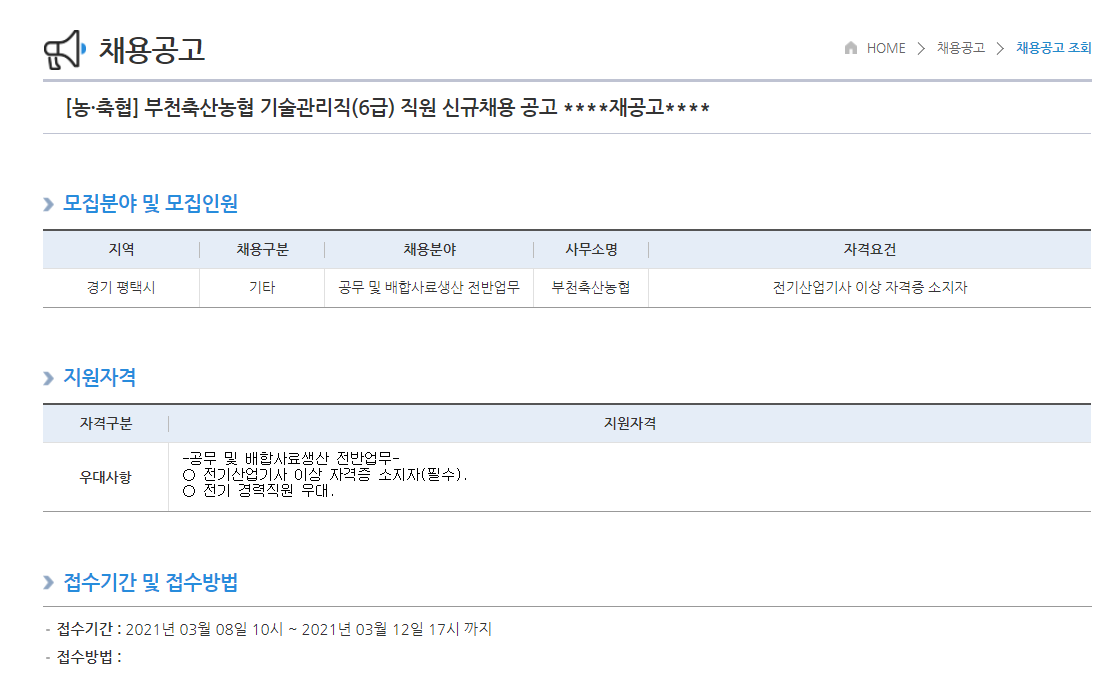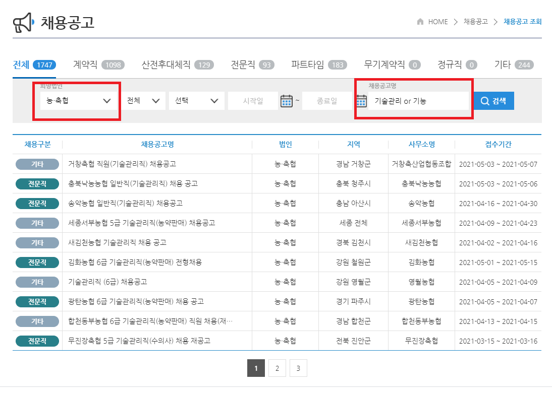 "농 축협"으로 선택하고, 검색창에 "기술관리" 혹은 "기능" 이라고치면