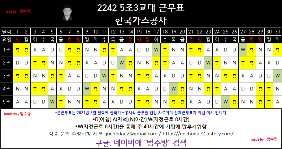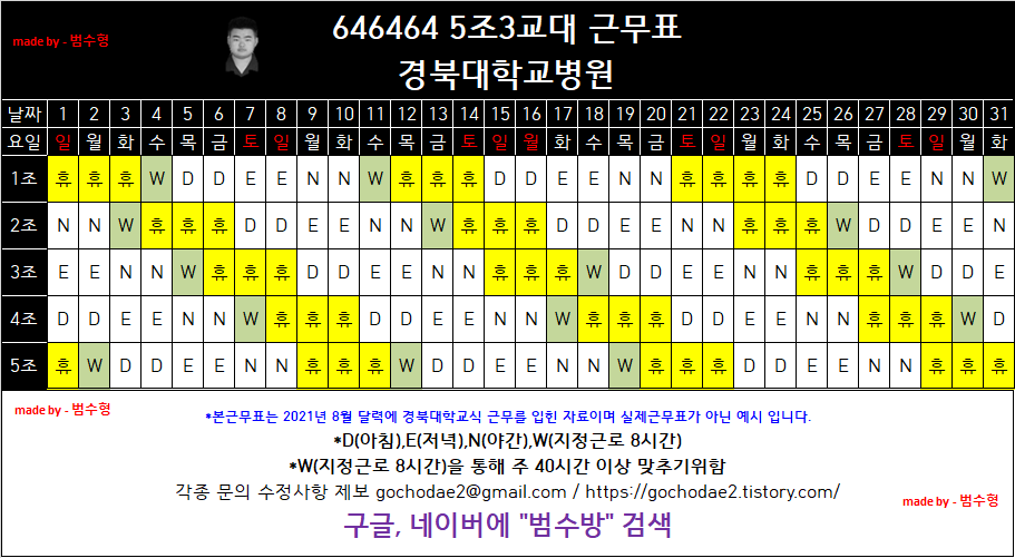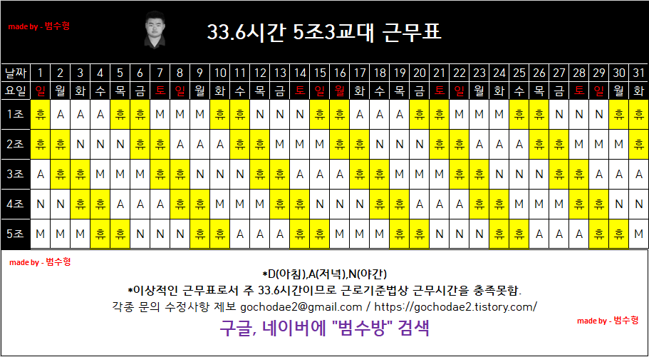 *또한, 현재 5조3교대 및 5조2교대에 대해 매우 활발하게 논의되고 급변하는 중입니다. 언제든 위의 근무는 다르게 해석되고 바뀔수가 있습니다.