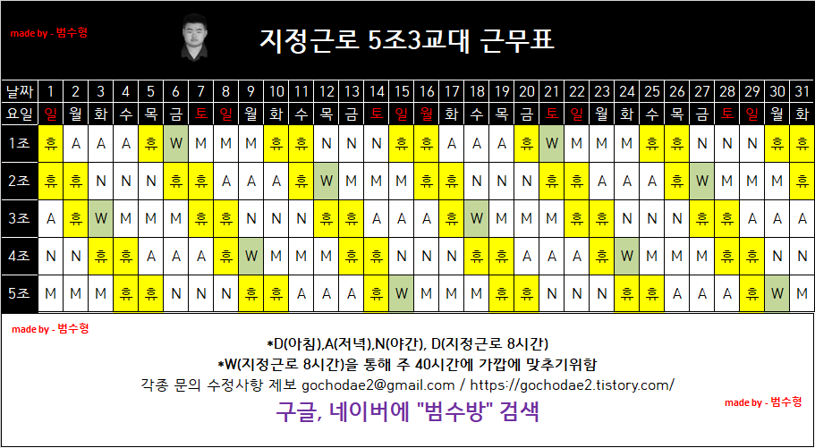 위 교대근무표 자료 엑셀 파일로 필요하신분은 댓글에 이메일 남겨드리면 자료 보내드리겠습니다.