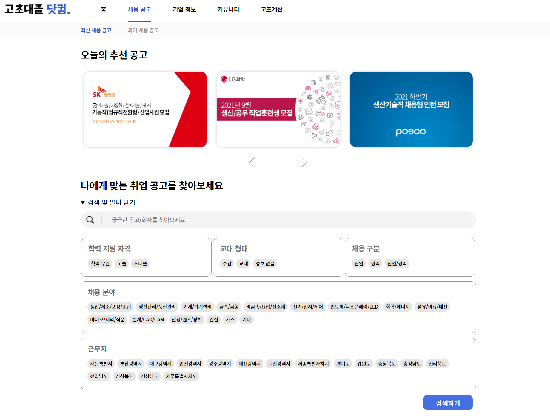 오직 고초대졸만을 위한 생산직 현장직 구인구직 플랫폼 고초대졸닷컴. 고초대졸 취업은 역시 고초대졸닷컴!