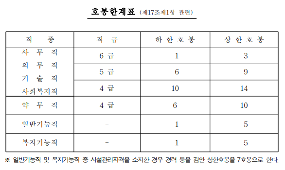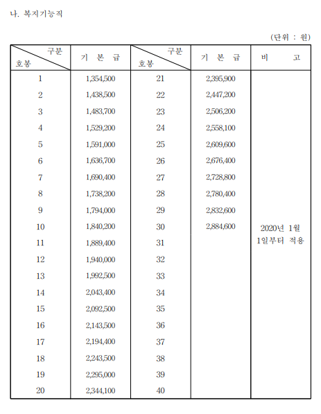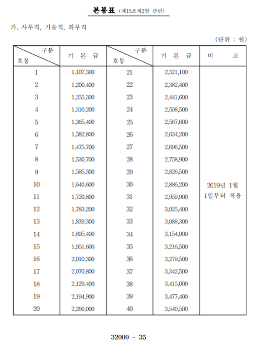 각 호봉표 및 직무급, 직무 가산급 표이다.