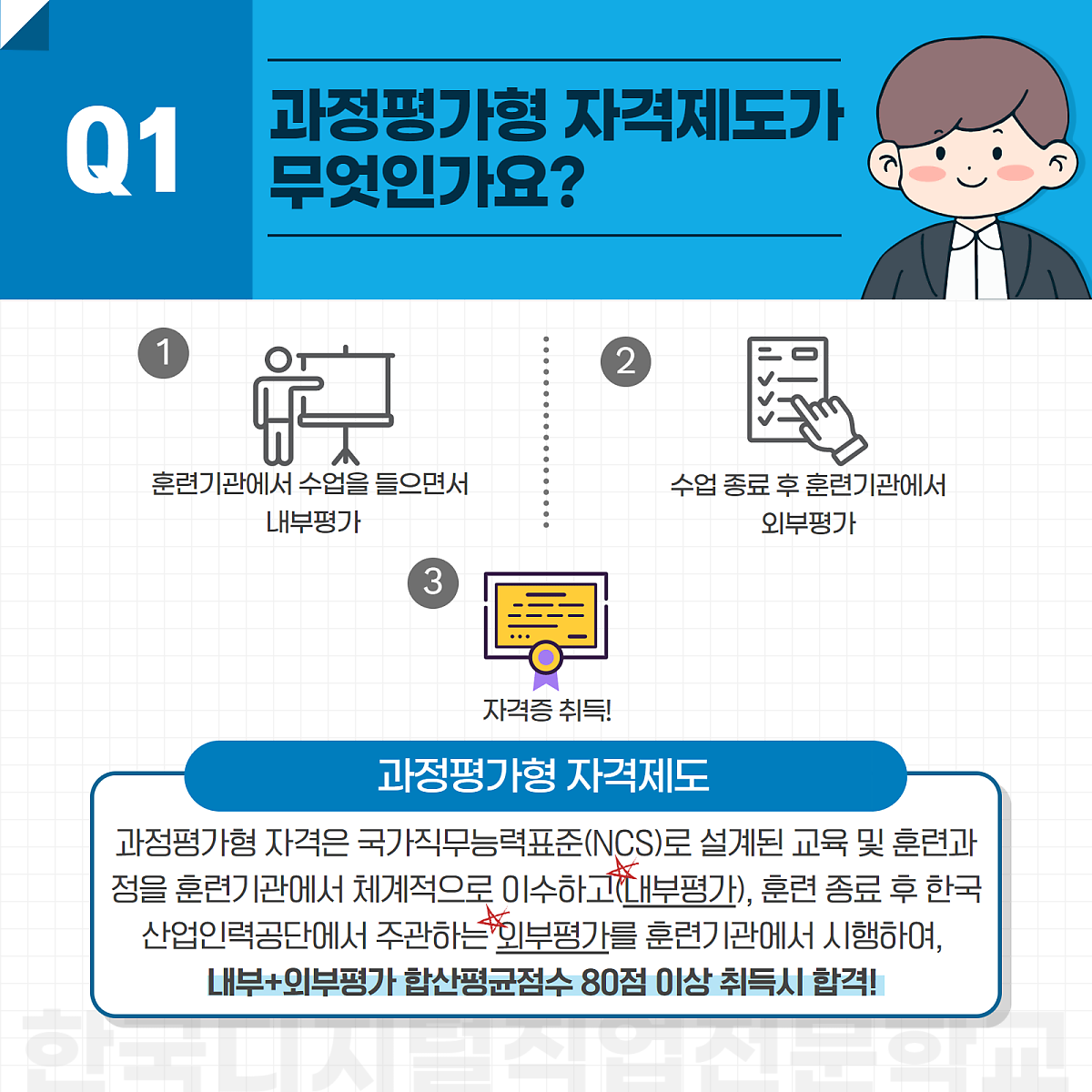 내부평가(평소 학습장에서 실시) 외부평가(평소 학습장에서 실시) 전국 개별 응시 후 종합 80점이상 합격 |