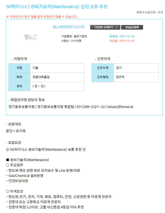 위 2021년 말 하이닉스 메인트 채용시 나왔던 보훈특별채용으로
