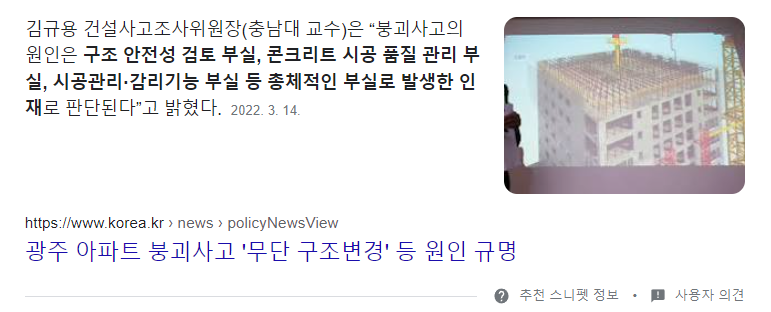 종전 있었던 광주 아파트 붕괴사건처럼,