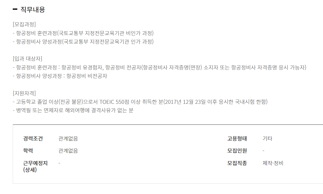 대한항공의 항공정비사 직업훈련과정이다