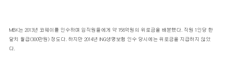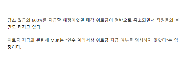 크게 이익을 볼 수 없는 사업의 매각은 개개인의 위로금을 크게 잡을 수가 없을 것이다.