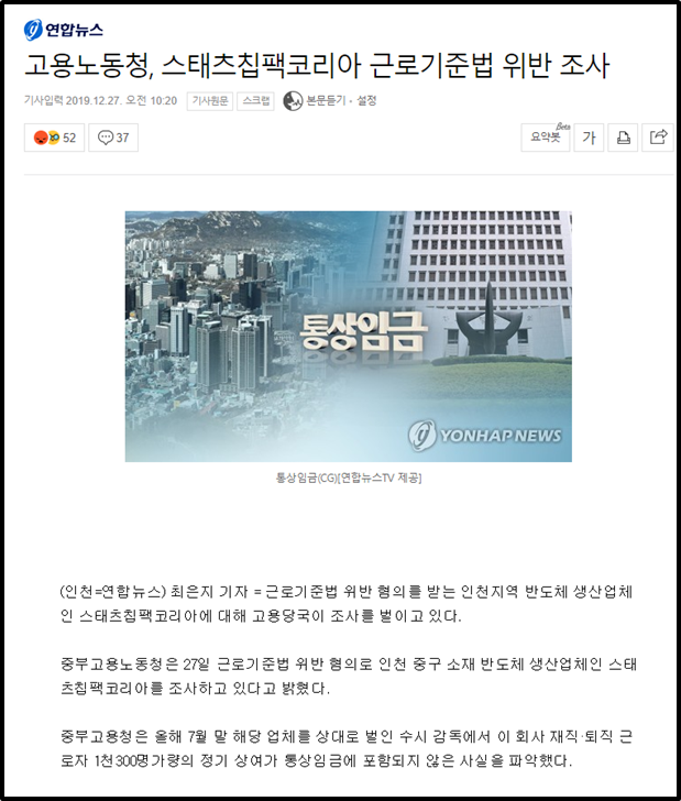 고용노동청으로부터 근로기준법 위반 조사를 받았다는 골자의 기사이다.