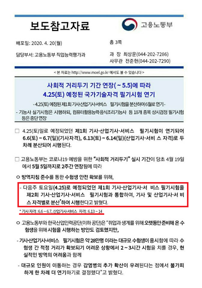 마침내 고용노동부에서 '기사시험 연기' 를 확정하여