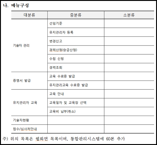 기술자관리, 증명서, 교육 등의 익숙한 항목이 보였다.