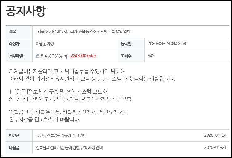 공지사항에 기계설비 관련 입찰이 올라와있다.