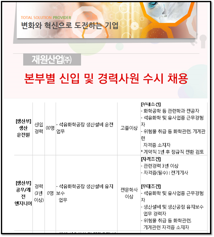화학과를 우대, 가스안전 자격우대이다.
