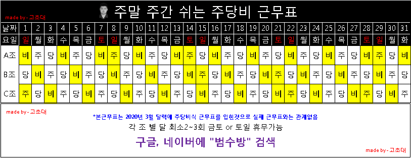 보통 이런 주당비 3교대 시설직 근무는 위와 같다.