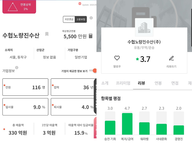 높은급여의 평점과 비슷한 연봉을 확인할 수 있었다.