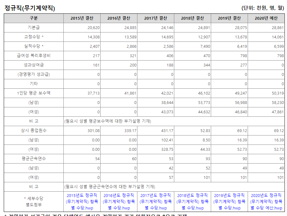 무기계약직(기능직, 유지직) 전체의 평균급여 표이다.